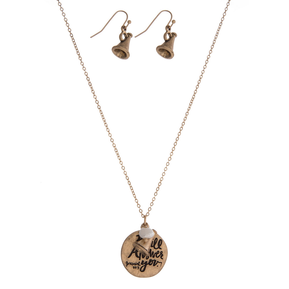 Gold tone necklace set with a circle pendant stamped with "I will answer you" and matching fishhook earrings. Approximately 16" in length.