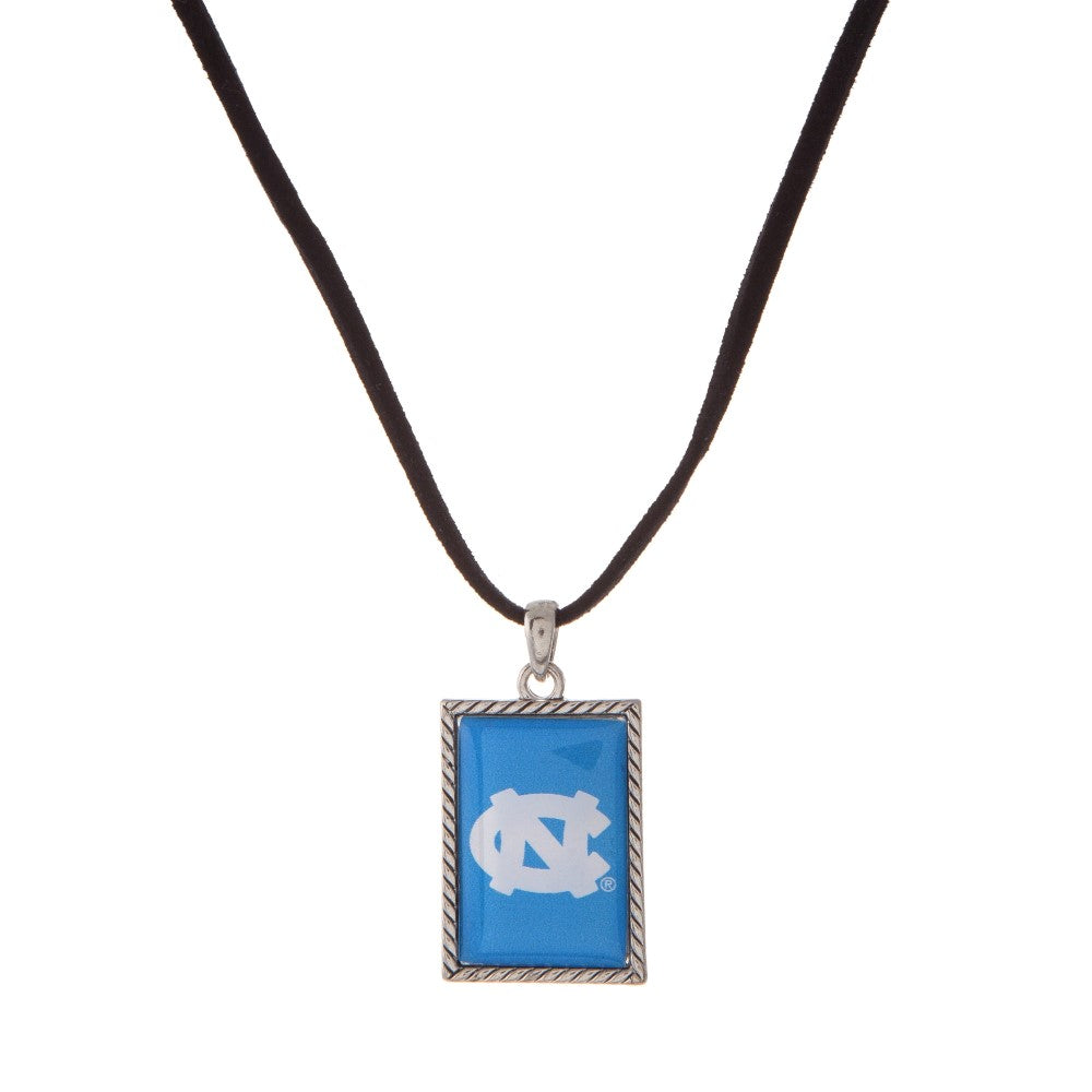 Officially licensed University of North Carolina necklace with black cord and a square logo pendant. Approximately 16" in length.