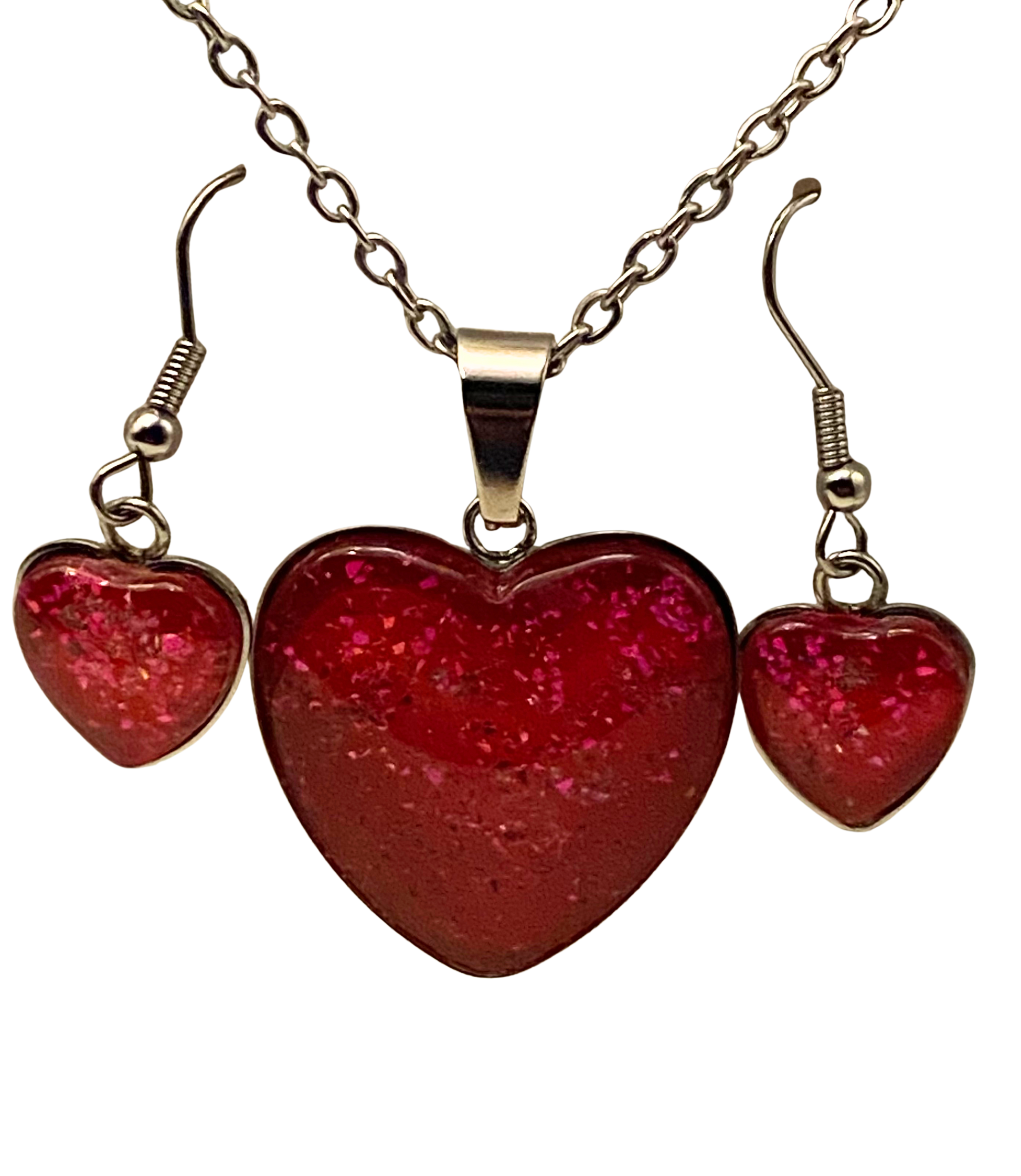 Red Heart Art Valentine Set. Necklace was made with Stainless Steel. Pendant is approximately 1 inch. Dangle earrings are approximately 1.26 inches in length. Avoid water with the art work. Comes with an 18" chain.