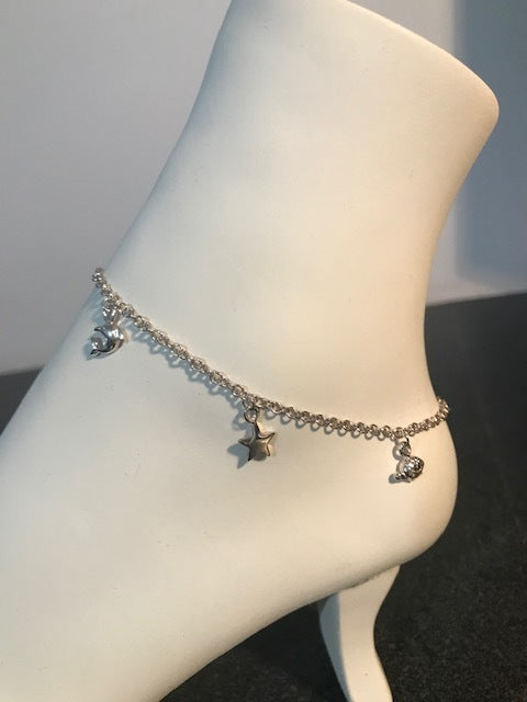 .925 Sterling Silver Anklet with Stars, Moon, Dolphin, and Turtle. SRP $36