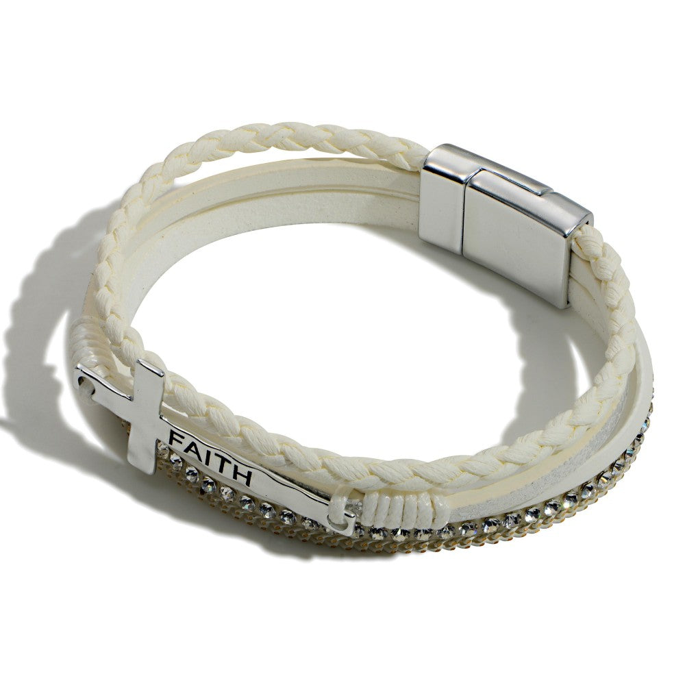 White leather and rhinestone Faith Cross Bracelet with magnetic closure. Approximately 7.25”